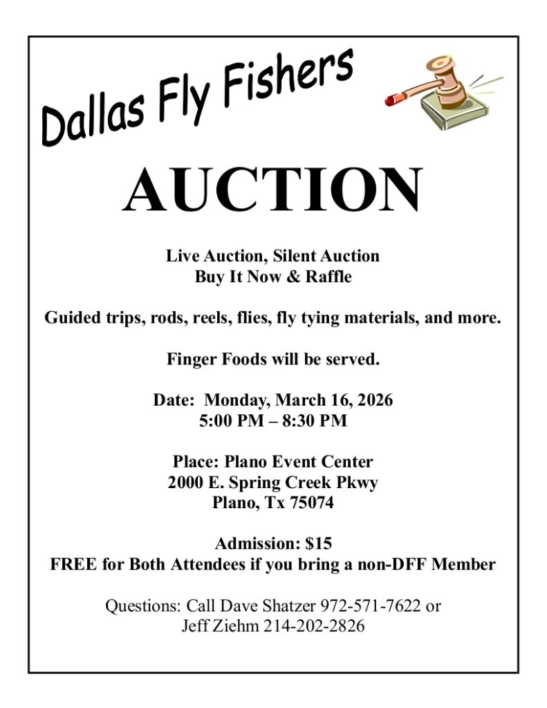 The DFF Auction is Monday, March 16 at the Plano Event Center. This fund raiser will feature trips, rods, reels, flies and more. If a Dallas Fly Fisher brings a non-DFFer friend, like us, you both get in free. So find your buddy on the other side of town, and enjoy this, and their only fund raiser of the year. See you there.